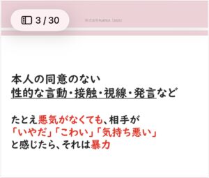 結論から述べると、性暴力とは「本人の同意のない性的言動(接触、視線、発言など)」。たとえ悪気がなくても、相手が「嫌だ」「怖い」と感じれば該当します。この定義を基に、以下の様な内容は性暴力に値すると例などを出し、あいこさんが説明しました。